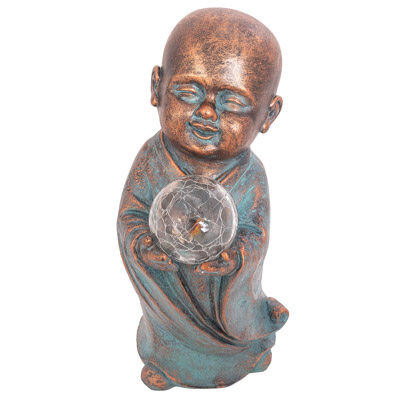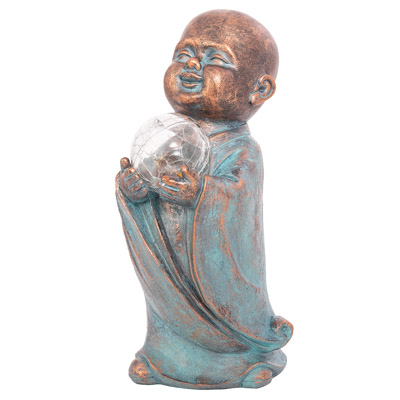 SALE – This Garden Accent Looks Like It’s Made of Copper With a Verdigris Finish, But the Figurine is Really Made of Cast Resin – This Buddha Holds a Solar-Powered Ball That Lights Up to Decorate With High-End Style