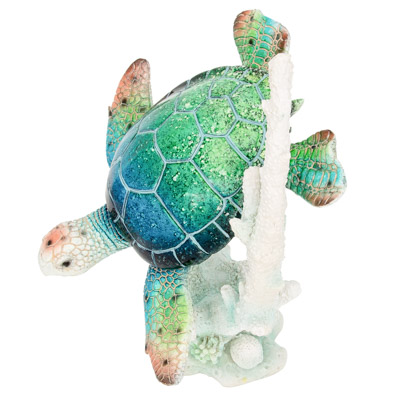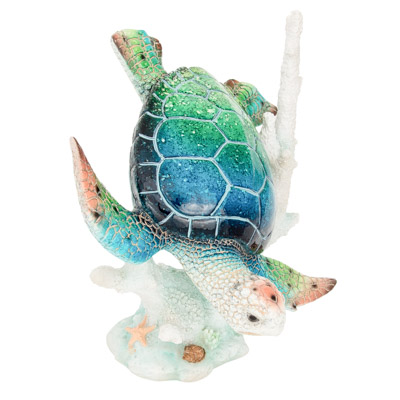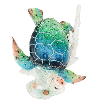 This Stunning Figurine has a Sea Turtle Diving Downward on a Coral Reef Base – A Truly Decorative Coastal Accent at a Great Price Point – It’s Made of Polystone with this Shiny Turtle’s Shell Colored in an Ombre Style of Blue to Green