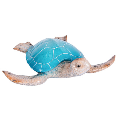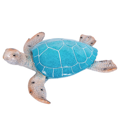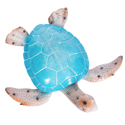 SALE – Large Size Turtle Figurine with a Pretty Shiny Aqua-Colored Shell and Textured Head and Flippers – A Decorative Seaside Accessory Made of Polystone with Great Realistic Detailing at a Great Price – Even Has Slots Underneath So It Can Be a Coastal Wall Decoration As Well