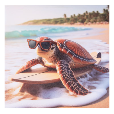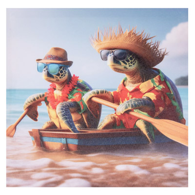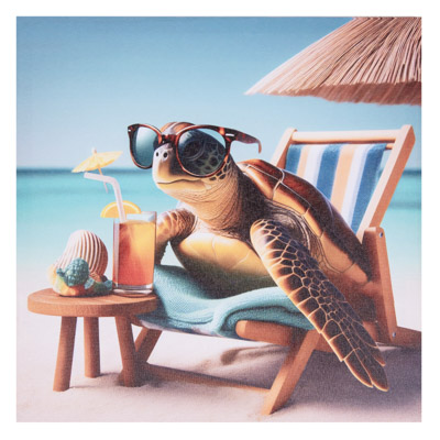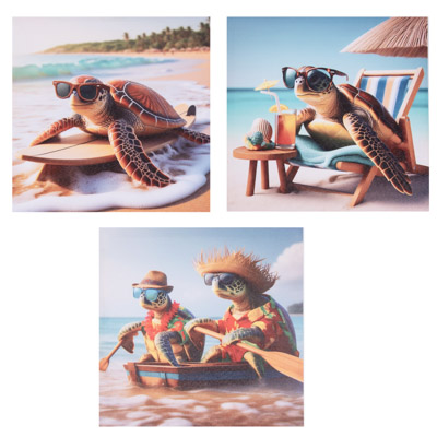 Here’s an Assortment of Three Different Square Water-Proof Color Canvas Wall Hangings with Cute and Comical Sea Turtle Art – These Amusing Turtles are All Enjoying a Sunny Day on the Sand at the Beach Complete With Chairs, Umbrellas, Boats, Surfboards, Hats, and Sunglasses – Bright, Colorful, Whimsical, Fun Decorative Wall Decor at a Great Price Point