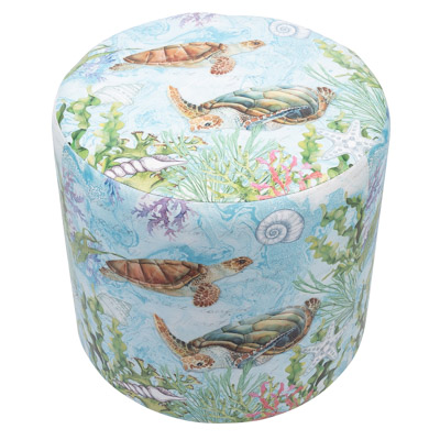 It’s a Beautiful and Practical Coastal Ottoman or Foot Stool – It’s Round, Covered with Leatherette with Sea Turtles in an Attractive Underwater Scene – A Versatile Furniture Accessory to Use as an Extra Seat, Put Your Feet Up, Move Around Wherever It’s Needed or Just Decorate With Because It Looks Super