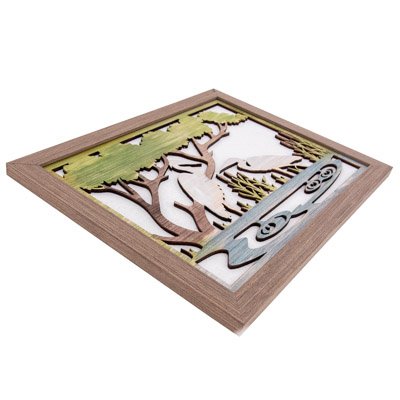 Unique Framed Dimensional Wall Decor of Made of Cut-Out Layers of Wood – There’s a Raised Scene of Two White Herons Standing in the Water Under the Shade of a Big Tree On a White Background – Very Peaceful Setting and the Colors are Subtle to Add to the Tranquil Feel