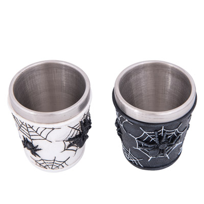 SALE – An Arachnid Shot Glass That Comes Assorted in White or Black Color – Made of Cast Resin with a Metal Lining, So It’s Really Usable, That is, If You Not Scared of Spiders – Each is Covered with a Design of Cobwebs and Spiders for Serving Guests, Goblins, and Ghosts, or Toasting Halloween Year Round . Must be Ordered in Multiples of 2.