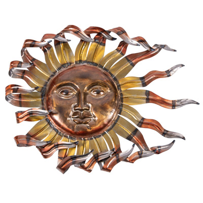Stylized Metal Wall Hanging of a Sun Face With Its Rays Looking Like They Have Been Blown and Bent by the Wind – Decorative Accent in Rich Coppertones With Golden Highlights to Shine Down All the Time Whether It’s Day or Night – Great Price Point for Such a Lovely Piece