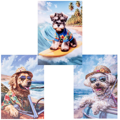 Your Customers Will Want Every One of this Assortment of Three Different Water-Proof Color Canvas Print Wall Hangings with the Cutest Doggies Ever – These are Beach-Loving Dogs All Enjoying a Sunny Day at the Seashore Riding in Cars and On Surfboards – Bright, Colorful, Whimsical, Fun Decorative Wall Decor for Puppy People and Beach Bums – Must Be Ordered in Multiples of Three