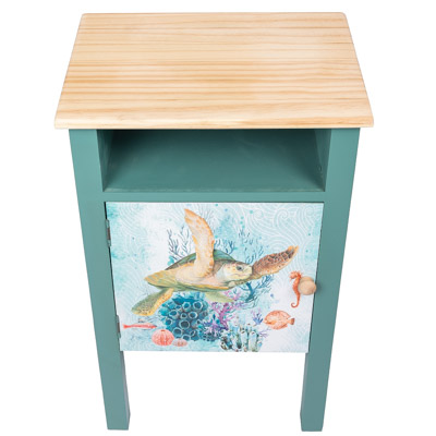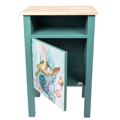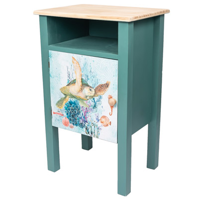 This Practical Wooden Cabinet is a Delightful Seaside Furniture Accessory With Lots of Appeal – It Makes a Perfect Bedside Nightstand or Cute End Table with a Swimming Sea Turtle Graphic on the Front Door – It’s Painted a Rich Aqua Blue Color and the Coordinating Top and the Knob is Left Plain to Accent the Design