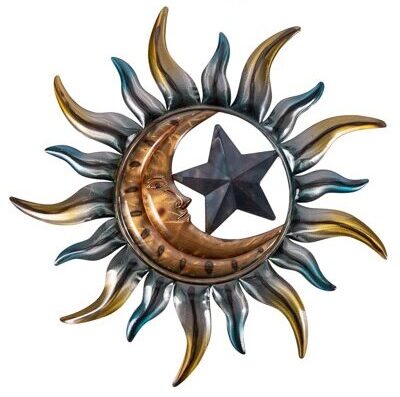This Heavenly Wall Decoration Really Shines – Uniquely Artsy Design of Celestial Planets with a Face on a Crescent Moon and a Star in The Center, Surrounded by the Rays of the Sun – Made of Metal and Finished with Metallic Shades of Blues and Coppers That Really Compliment Each Other