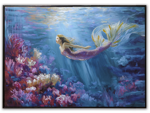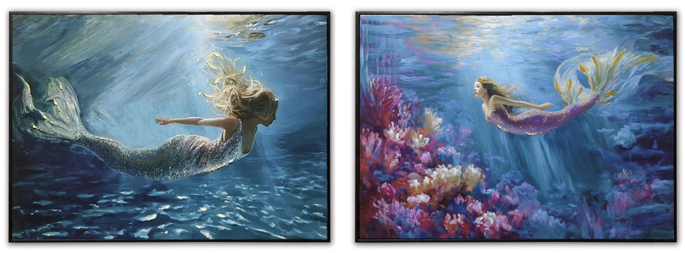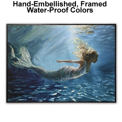 High-Quality, Hand-Embellished Gel Giclee Wall Decor – This is an Assortment of Two Different Swimming Mermaid Scenes That Look Great Together – Each Evocative Underwater Mermaid Square Canvas Print Has a Modern Black-Colored Floating Frame to Compliment the Artwork and is Decorated with Touches of Paint and Metallic Sparkle with Waterproof Colors – Must Be Ordered in Multiples of Two