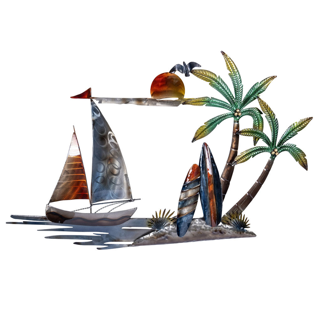 This Tropical Island Oasis Has Two Surfboards Standing Against a Palm Tree With a Sailboat at the Water’s Edge – There’s Even a Sea Gull and the Sun Peaking Behind the Cloud – Just Having this All Metal Wall Art Hanging Will Bring a Relaxing Vibe to Any Room – Now You Just Need to Bring Your Own Hammock, Suntan Lotion, and Umbrella Drink and Really Chill