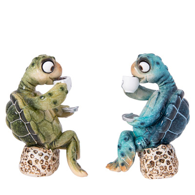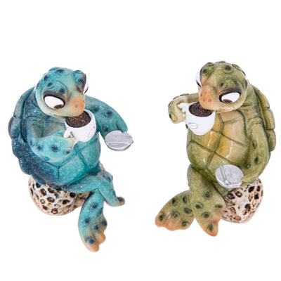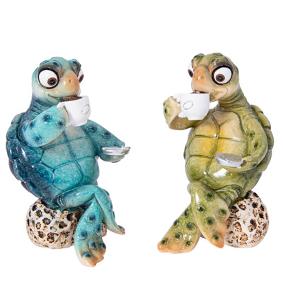 This Assorted Sea Turtle Figurine Comes in Two Different Colors and is Made of Polystone – It’s as Whimsical as Can Be, With This Cute Turtle Seated on a Rock Sipping Coffee, or Maybe It’s a Cappuccino, an Espresso, or a Latte.  Must be Ordered in Multiples of 2.