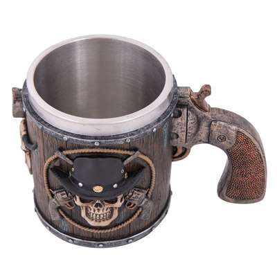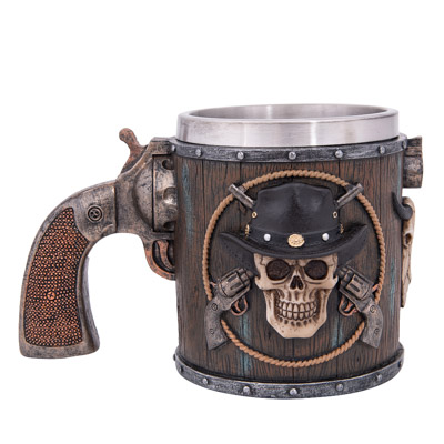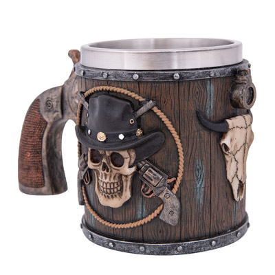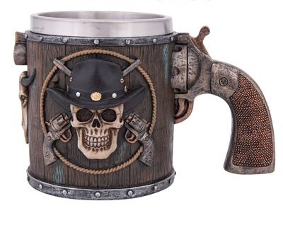 SALE – Unique Drinking Mug with a Skull in a Cowboy Hat and a Gun for a Handle – There’s Even a Cow Skull Decoration to Complete That Western and Memento Mori Theme – Grab That Six Shooter and Raise a Toast to Long Life Because It’s a Usable Mug Made of Detailed Cast Resin with Metal Lining