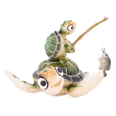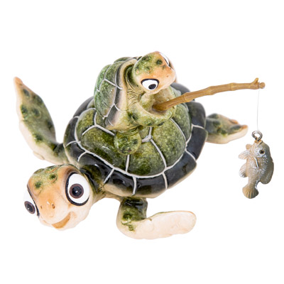 Everybody Needs a Relaxing Hobby, and for This Duo of Big-Eyed Green Sea Turtles, It’s Fishing – They Teamed Up to Hook “Em and Reel ‘Em In – Made of Polystone, the Smaller Turtle With the Cane Pole Fishing Rod Sits on the Back of the Larger One – Makes a Great Catch for Your Favorite Fisherman or Turtle Collector
