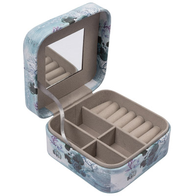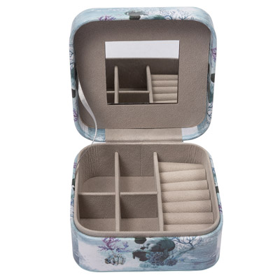 A Gift for Someone to Celebrate Florida’s Beloved Marine Mammal, the Manatee – This Decorative Leatherette-Covered Jewelry Box Has a Outside Design of a Family of Sea Cows Swimming Underwater on an Aqua Background and Inside Compartments to Store Earrings, Rings, Pins, and Other Items of Jewelry With a Mirror Under the Lid