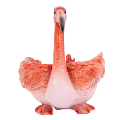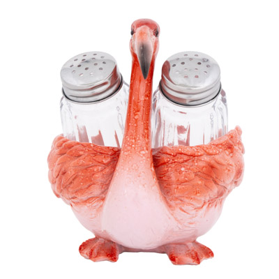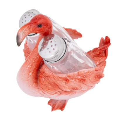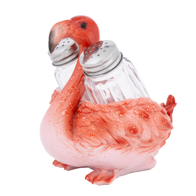 This Polystone Pink Flamingo Carries a Pair of Salt & Pepper Shakers on His Back in His Wings – A Whimsical Yet Practical Addition to a Tropical Themed Kitchen – This Useful, Inexpensive, Decorative Set Comes Complete with the Metal and Glass Shakers