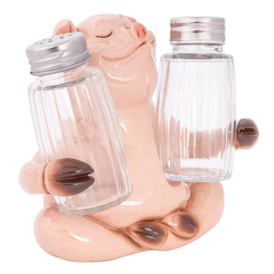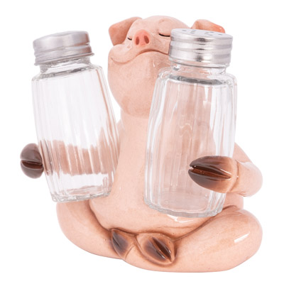 A Polystone Pig Offers Up Salt & Pepper Shakers for a Practical and Decorative Addition to the Farmhouse Table or Country Kitchen Counter – This Little Piggy is Happy to Be Serving and Not Served and the Set Comes Complete with the Metal and Glass Shakers