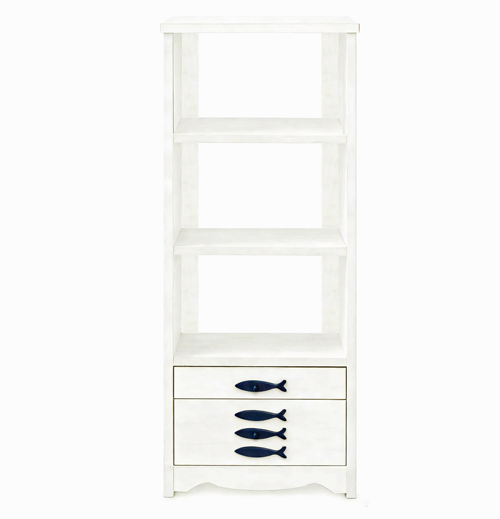 This Tall White Wooden Cabinet Will Fit Perfectly in Any Space You Need More Storage, Bedroom, Bath, or Hall – Three Shelves and Two Drawers With Blue Fish as the Handles – A Seaside Furniture Accessory that’s Pretty and Practical and Can Display What You Want to Show Off and Hide What You Don’t