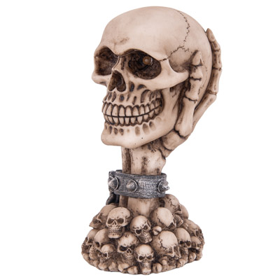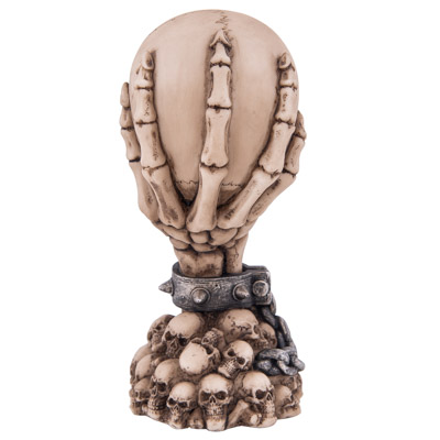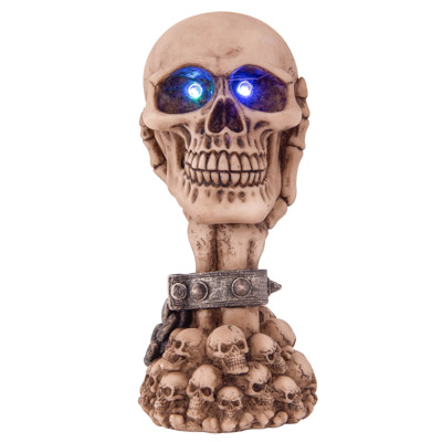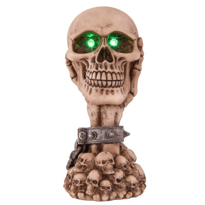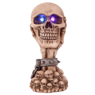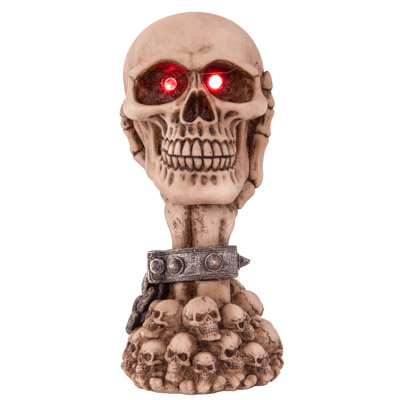 Don’t Be Afraid, It’s Only Made of Resin – There’s a Bony Skeletal Hand Rising Up From a Mound of Skulls and In the Fingers of the Hand is a Larger Skull with LED Light Up Eyes – Works Off a Battery and the Eyes Change Colors – Makes a Great or Should We Save “Grave” Halloween Decoration at a Bare Bones Price Point