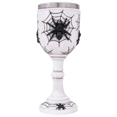 Make Any Happy Hour Halloween With This Wine Goblet – It’s Made of Cast Resin with Metal Lining and is an Actual Usable Drinking Glass – It’s Contrasting White Background with Big Black Spiders and Their Big Spider Webs Makes for a Dramatic Creepy Crawly Vessel, Be It Red or White Wine or a Magical Potion