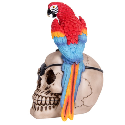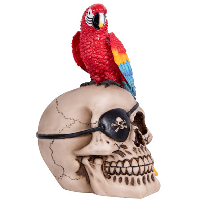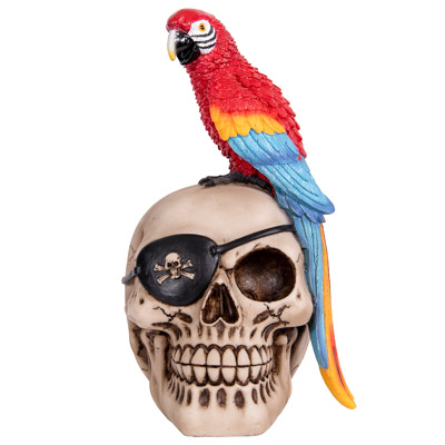 It’s a Decoration Made Entirely of Cast Resin – It’s Pretty Obvious That This Skull Belonged to a Dreaded Pirate, What With His Jolly Roger Eye Patch and Macaw Parrot – They Say Dead Mean Tell No Tales, and This One’s Certainly Not Saying Where the Body’s Buried, Maybe With the Treasure Though