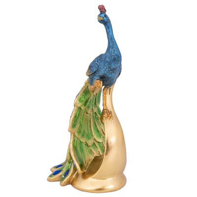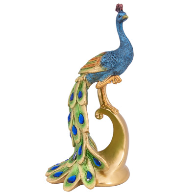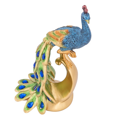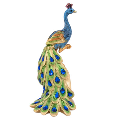 Here’s a Regal Looking Polystone Indian Peacock Figurine Perched on a Curved Pedestal – His Beautiful Train of Long Flowing Tail Feathers Hang Down and Each Feather is Accented with Blue Gemstones Making Him a Decorative Accent to Really Show Off