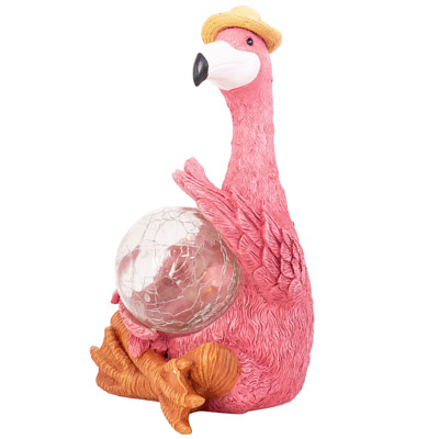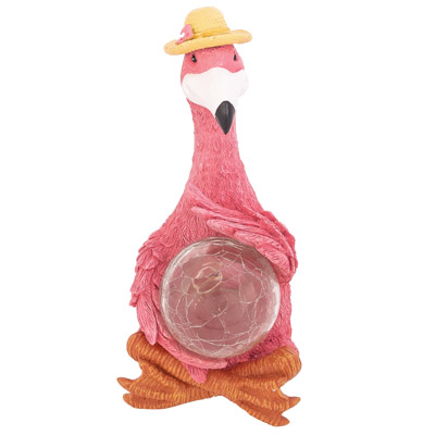 SALE – Cute Pink Flamingo Holding What Appears to be a Crystal Ball in Her Wing Tips – Figurine is Made of Cast Resin and the Solar-Powered Ball Lights Up – You Know She’s Happy to Be Seated in a Yoga Pose in the Garden as a Decorative Accessory Because She Has Her Straw Hat On