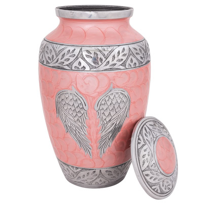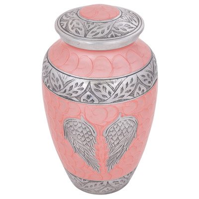 High Quality Urn for Cremation Ashes Made of Aluminum With a Secure Threaded Lid – Lovely Pink Finish with Etched Bands of Silver and a Pair of Angel Wings Etched Into the Front – Engravable