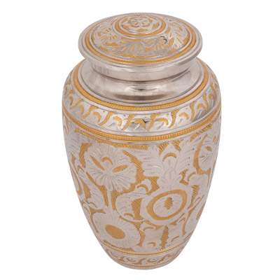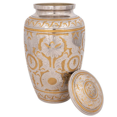 High Quality Urn for Cremation Ashes Made of Aluminum With a Secure Threaded Lid – Colors of Gold and Silver with an Elaborate Etched Design