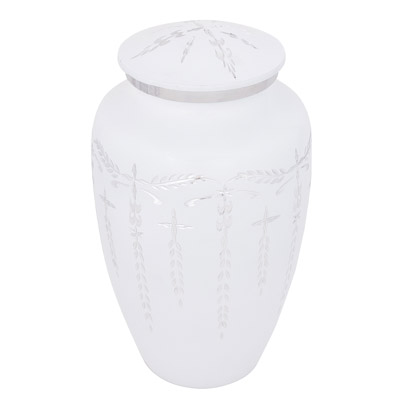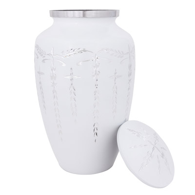 High Quality Urn for Cremation Ashes Made of Aluminum With a Secure Threaded Lid – White Finish with Etched Design of Silver – Engravable