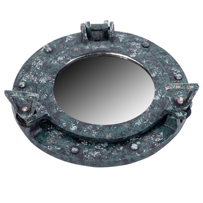 The Most Classic of All Nautical Wall Decorations – A Ship’s Porthole Mirror – Made of Aluminum, Done in a Verdigris Color and Finished to Appear as If Aged By Salt Spray – Round Mirror Sits in the Center of Porthole