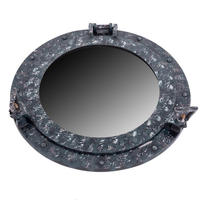 A Truly Classic Nautical Wall Decoration Made of Aluminum and Finished in a Artistic Verdigris Patina – A Round Ship’s Porthole With a Mirror in the Center Makes a Functional Accent to Hang in Any Room from Entry, to Bedroom, to Hall, to Bath