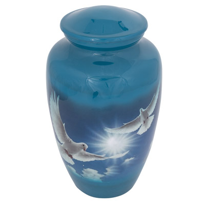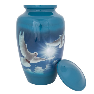 High Quality Urn for Cremation Ashes Made of Aluminum With a Secure Threaded Lid – High Shine Enameled Finish With Two White Doves Flying on a Background of Heaven
