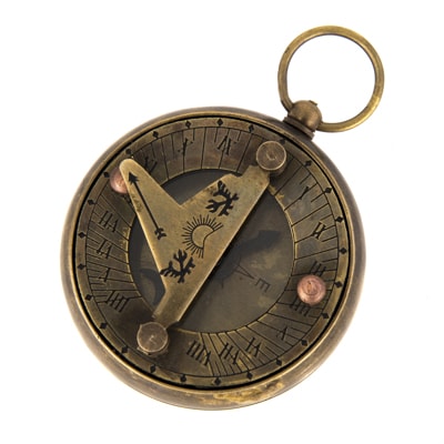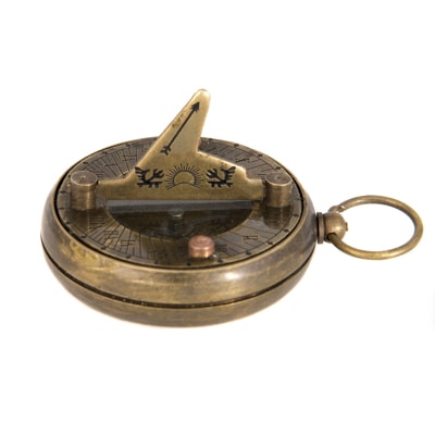 Antique Reproduction Pocket Compass and Sundial With Folding Gnomon on Top – There’s an Etched Design of a Sailing Ship on the Back – Great Detailing in This Working Replica Made of Brass with Antiqued Patina Finish – A Navigational Instrument that Really Looks Like It Carries Some History