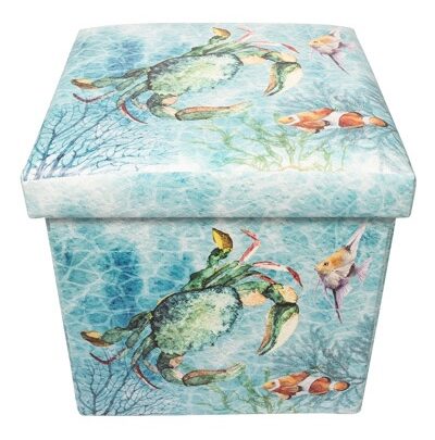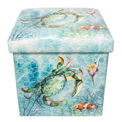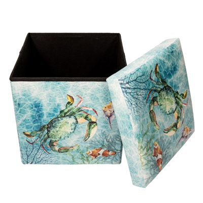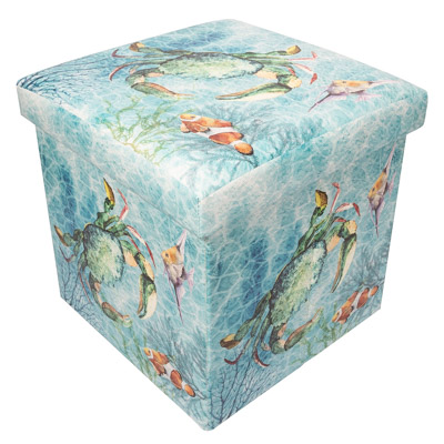 Here’s What You Want to See That Will Hide What You Don’t Want to See – This Decorative Leatherette-Covered Storage Box has Graphics of a Crab and Fish on an Aqua-Colored Background on All Sides of the Cube – It’s a Pretty and Practical Furniture Accessory That Folds Flat When Not In Use