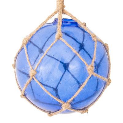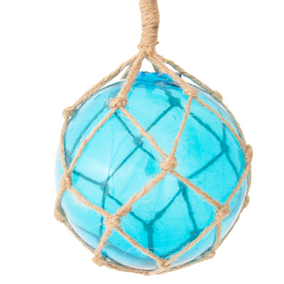 A Reproduction of a Vintage Japanese Fishing Float Used to Keep Nets Afloat – This 6 Inch Diameter Glass Ball Buoy is Covered with Knotted Jute Rope and Comes in an Assortment of Blue and Aqua – Add a Colorful and Dramatic Touch to Any Nautical Vignette – Can Hang to Sit on Shelf.  Must be Ordered in Multiples of 2.