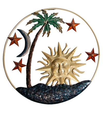 This All Metal Wall Decor Comes in Two Assorted Color Variations – Inside the Outer Ring is a Scene of the Sky Over a Tropical Island, with a Crescent Moon, Stars, Sun, and a Palm Tree. Must be Ordered in Multiples of 2