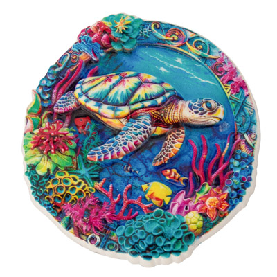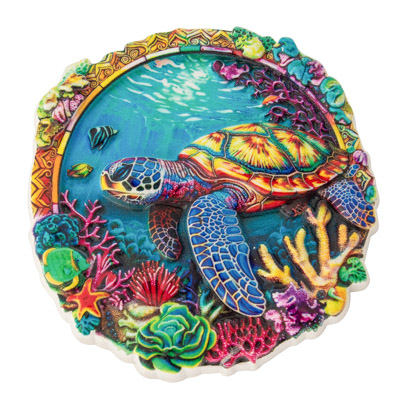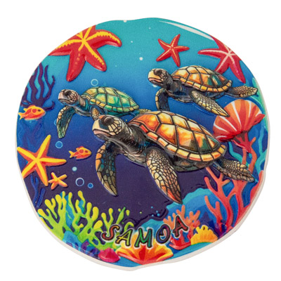 A Colorful Round Magnet of an Undersea Scene With a Sea Turtle for a Practical Souvenir – There are Three Different Designs That Make Up this Assortment, Priced Per Magnet – Made of Polystone With Irregular Edges to the Round Ornament that Make It Look Like Mother Nature Helped Form Them.  Must be Ordered in Multiples of 3.