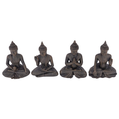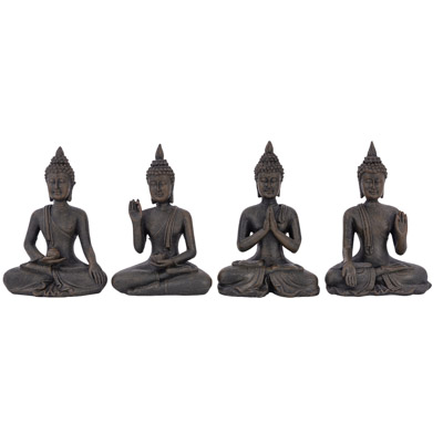Graceful Thai Buddha Figurine in Four Different Body Postures, Hand and Leg Positions – Assorted, All Seated with Legs Crossed and Hands Held in Different Mudras – Made of Cast Resin Colored to Look Like Iron or Darkened Pewter – Must be Ordered in Multiples of Four