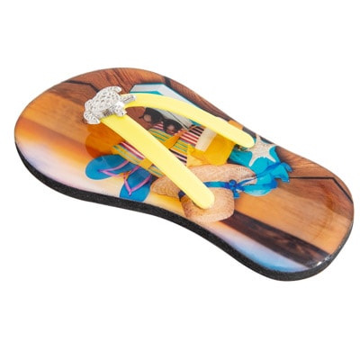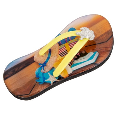 A Cute Inexpensive Beachy Souvenir That Has a Practical Purpose – An…Oh, So Colorful Flip Flop with a Yellow Strap and a Turtle that Has a Magnet Bottom to Keep Notes on the Refrigerator and Remind You of a Seashore Vacation