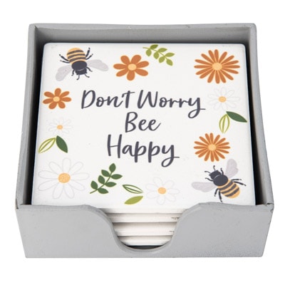 SALE – Pollinate the Room with This Bee-utiful Set of Useful Square Coasters Made of Ceramic – Each Coaster Features a Different Bee-Themed Message with Flowers – This Set of Four Coasters Comes With a Convenient Holder to Store the Coasters When Not Being Used