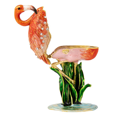 This Poised Pretty Pink Flamingo is an Enameled Metal Trinket Box Decorated With Rhinestones – Hinged to Open, It’s a Decorative Keepsake Itself and It Can Hold Small Treasures Inside – Has a Magnet Closure on Lid to Keep to Closed and Whatever is Inside Secure