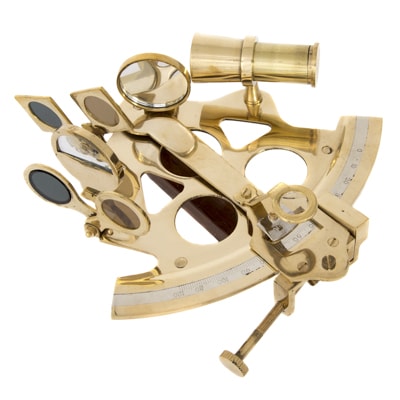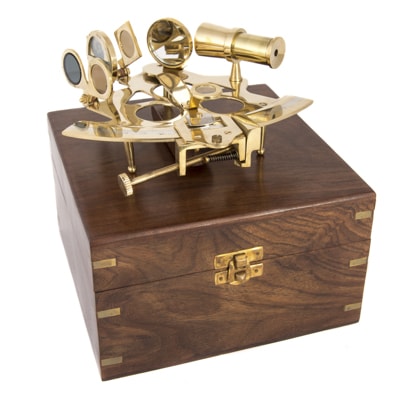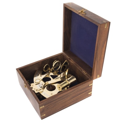 Beautiful Working Nautical Reproduction of Navigational Sextant Made of Brass – Comes in Hinged Wood Case with Inlaid Brass Anchor Design on Lid – Great Decoration or Gift for Sailor or Seaman