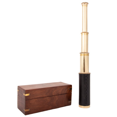 Handsome Real Working Brass Telescope with Case – Spyglass Style Scope Made of Brass with Leather Hand Grip, Extends Out 14 Inches for Use and Stores Inside Hinged 6 1/2 Inch Long Wooden Box with Inlaid Brass Anchor Design on Lid