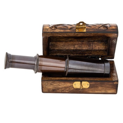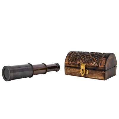 A Carved Wooden Box with Domed Lid Looks Like a Pirate’s Treasure Chest and Inside is a Handsome and Extendable Antique Brass Telescope, Not Unlike Something Blackbeard Himself Used