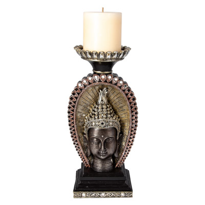 Here’s an Ornate Candle Stand With Buddha’s Face Surrounded by an Aura – Made of Polystone, It Can Hold a Pillar Candle (Not Included) on Top – Elegant and Dramatic Decorative Home Accessory That Looks Much More Expensive Than It Really Is