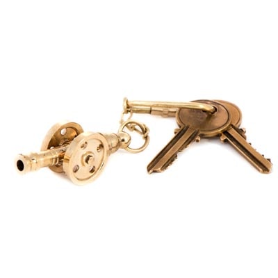 Incredible Brass Key Ring with Solid Brass Cannon on Two Wheeled Platform – Great Detailing with Moving Parts – Have a Piece of History to Guard Your Keys – Nice Gift or Souvenir Item – Shown with Keys Not Included