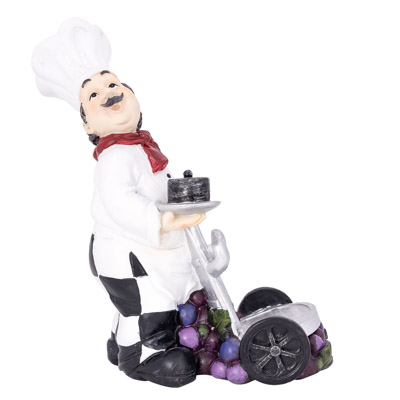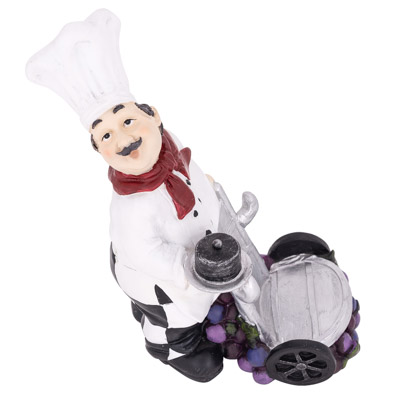 SALE – This Cast Resin Wine Bottle Stand has a Bunch of Grapes at the Base with a Chef Pushing a Trolley or Hand Truck – Place a Bottle of Wine on the Trolley for a Cute Kitchen Decoration or Gift for a Wine Lover