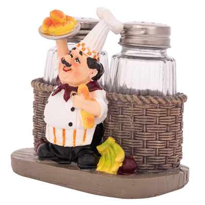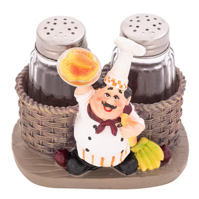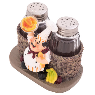 Here’s a Cute Decorative Addition to Any Kitchen and a Welcome Gift That the Recipient Can Actually Use – Proud Chef Standing on Base in Front of Two Wicker-Look Baskets That Hold Salt and Pepper Shakers – Made of Cast Resin with Glass and Metal Shakers
