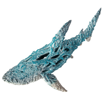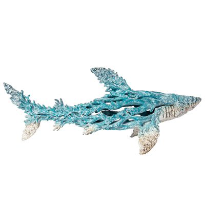 This Decorative Table Top Figurine of a Shark Rests on Its Tail and Pectoral Fins – Actually Made of Polystone But It Looks Just Like It’s Formed from Undersea Coral with Aqua Coloring – It’s a Stylized and Artistic Nautical Accessory