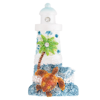 An Inexpensive and Colorful Souvenir Item That Is Useful, Too – Here’s a Polystone Magnet in the Shape of a Lighthouse and It’s Decorated with a Beach, a Palm Tree, a Sea Turtle, Glitter and Rhinestones – A Quick Seller for Additional Quick Profits