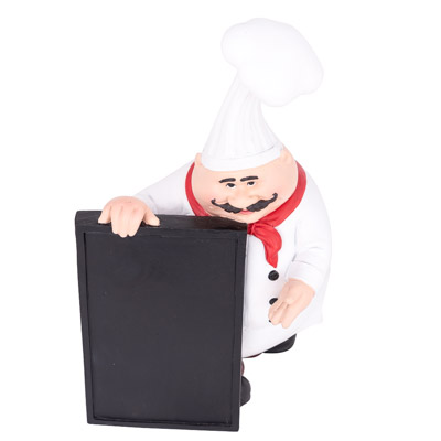 Friendly-Looking, Whimsical Standing Chef Figurine Holds a Black Board in Front of Him – Made of Polystone, He Makes a Great Kitchen, Restaurant, Cafe, or Gourmet Shop Decoration Can Be Put to Use as Signage